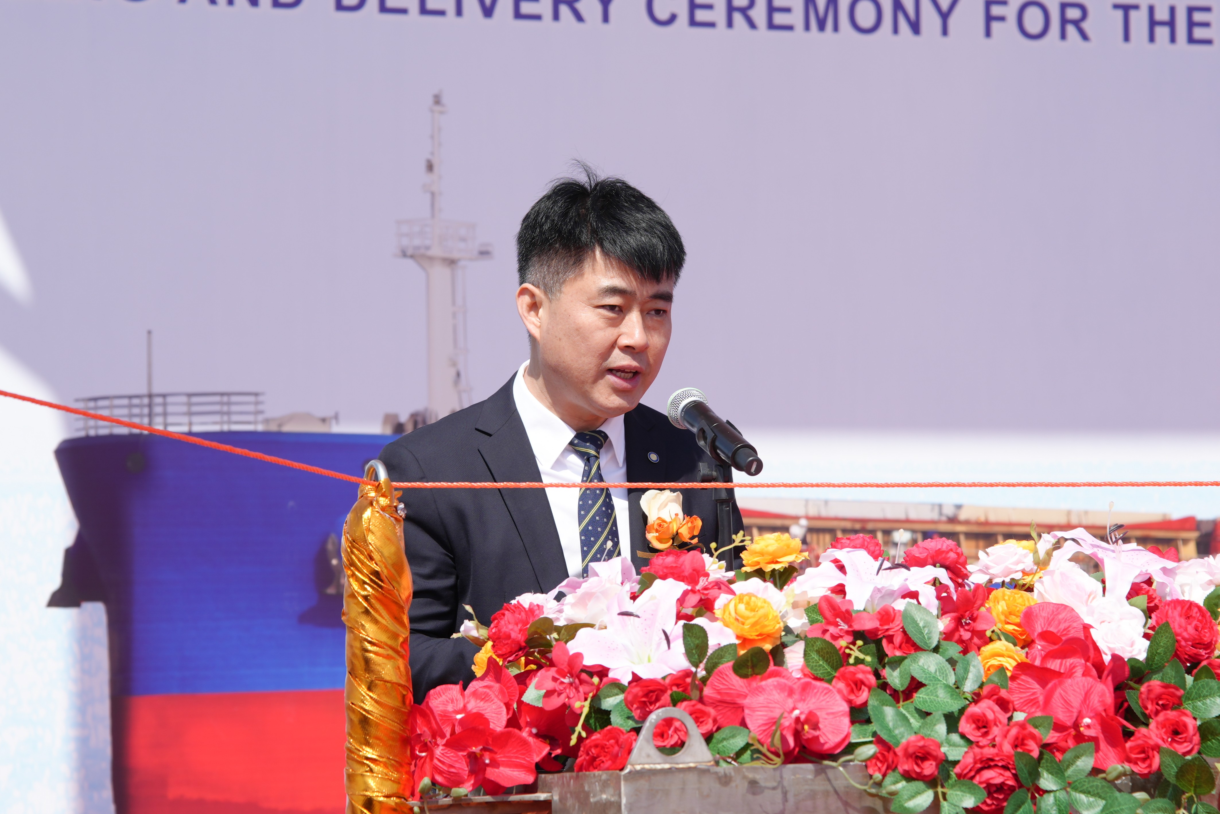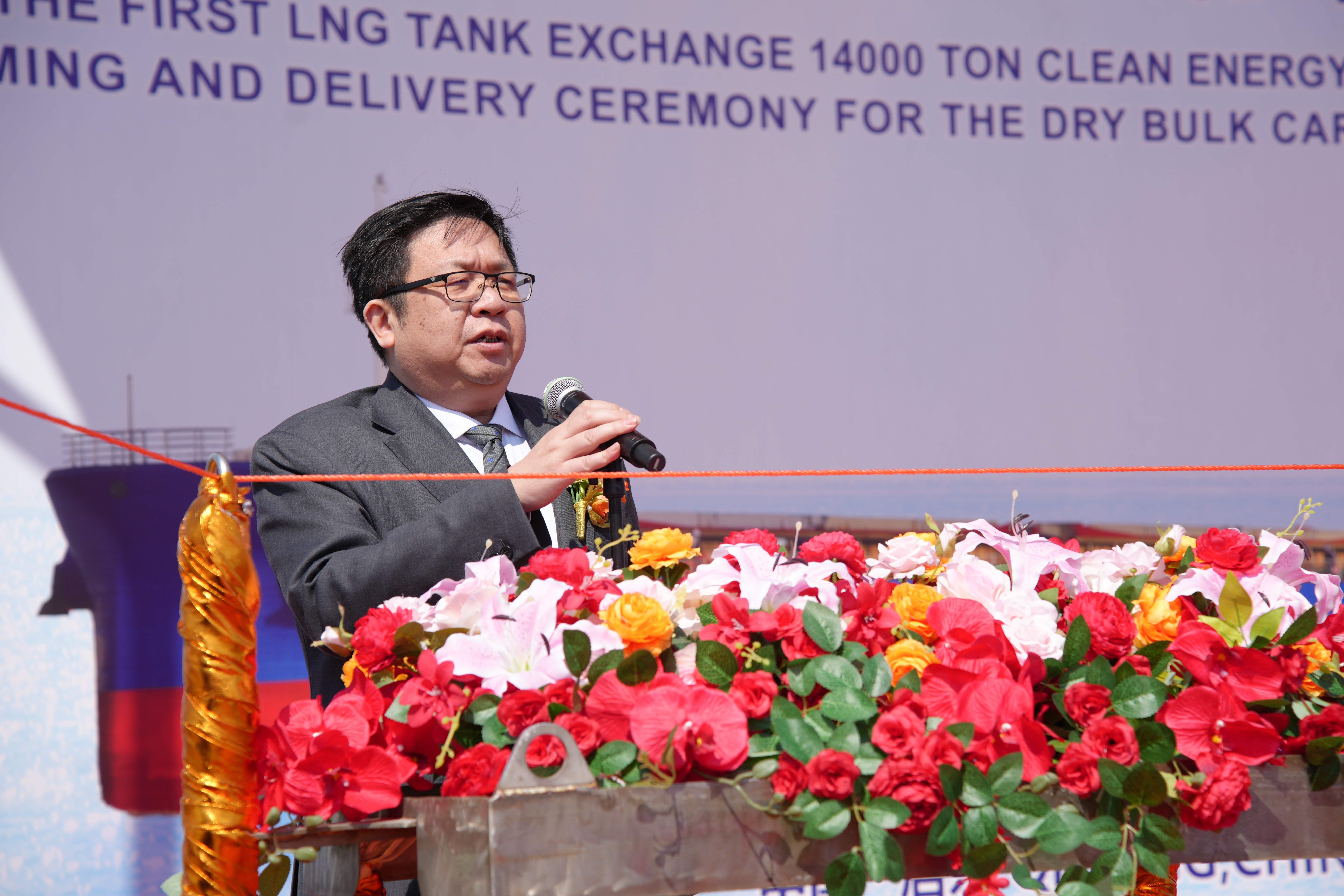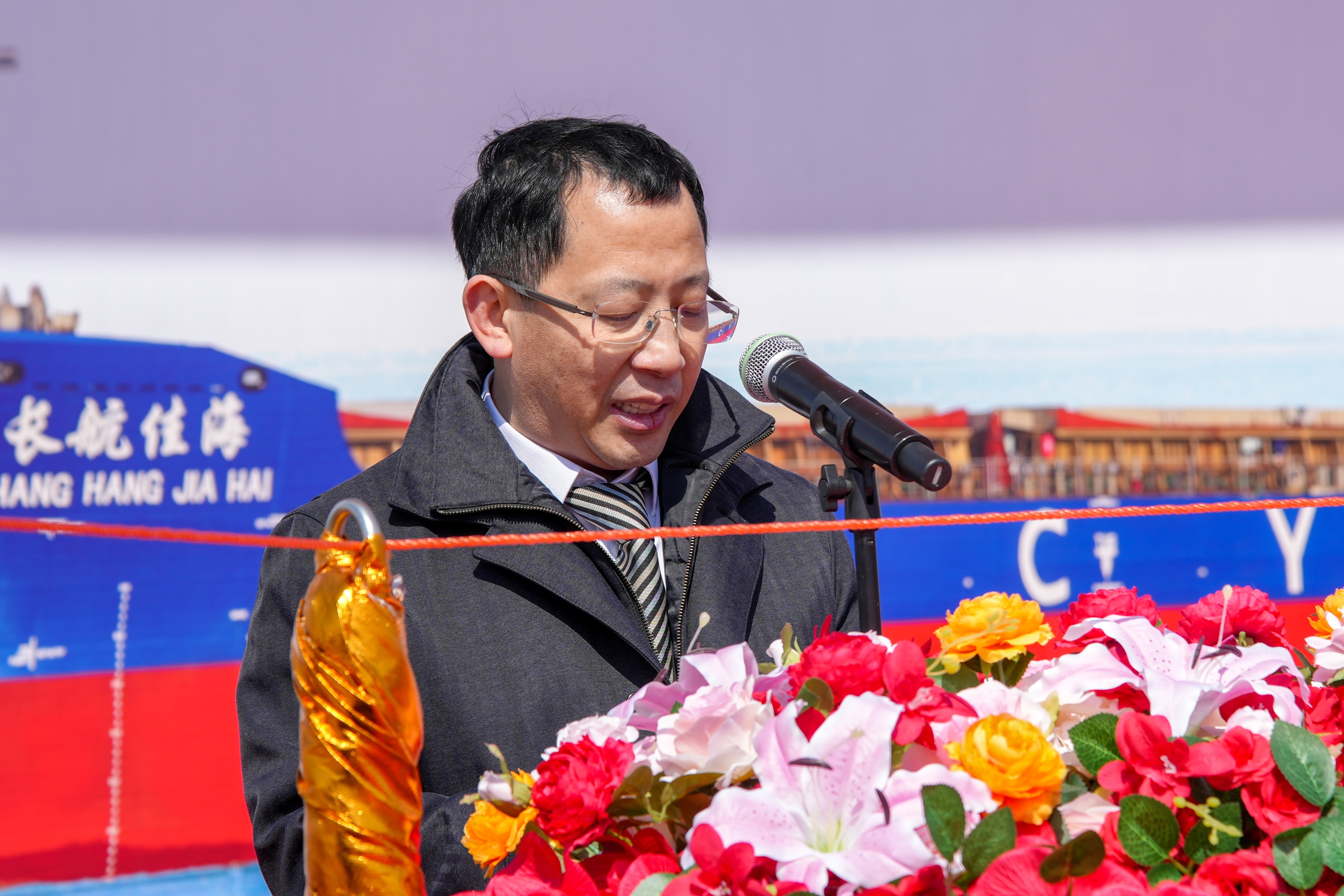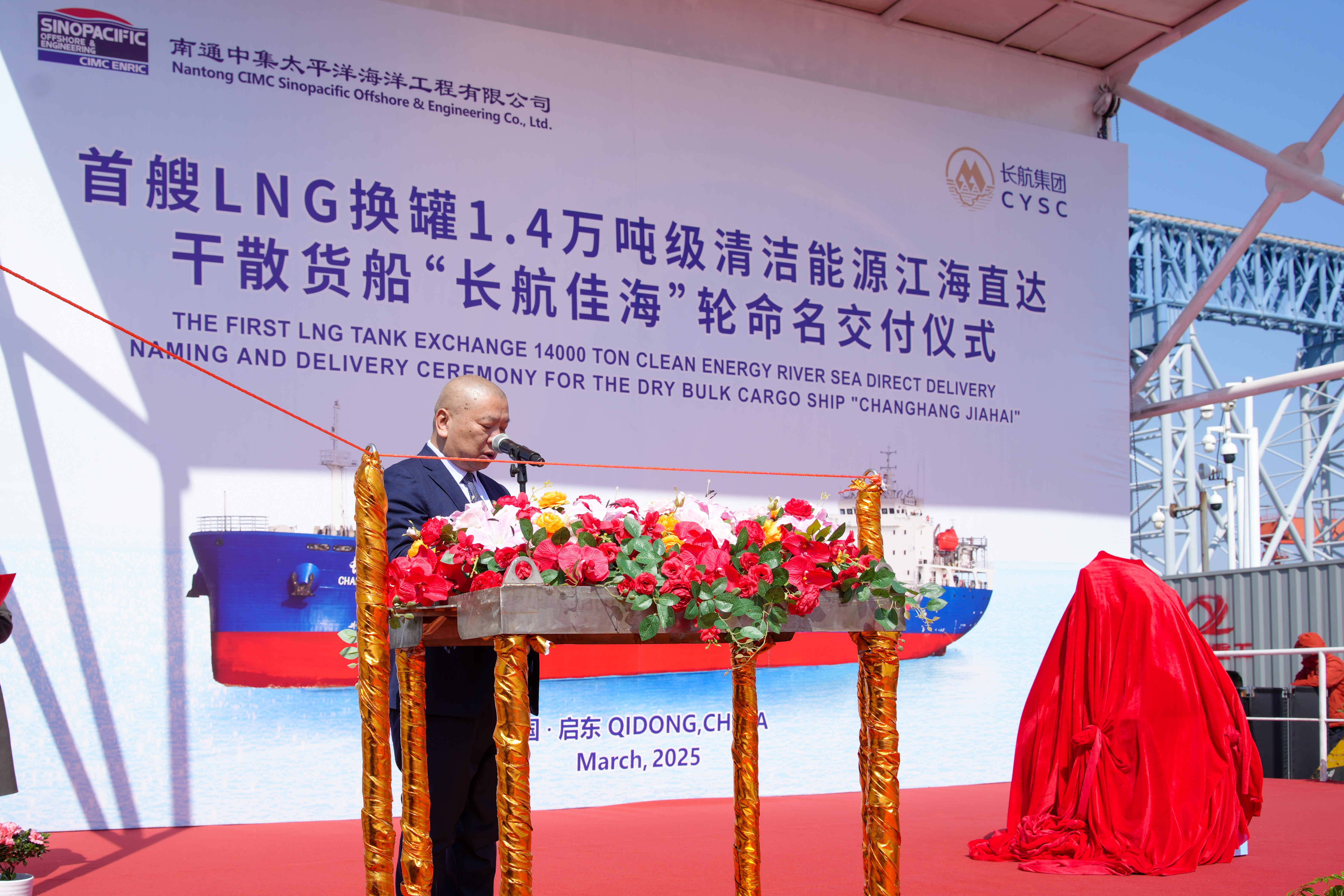 命名交付仪式上,中集太平洋海工造船事业部副总经理沈林涛代表公司致欢迎辞,他对各位嘉宾的到来表示热烈欢迎,并向所有为在S1087船付出努力的合作伙伴和同事们表示衷心的感谢。沈总强调:“S1087的交付是中集太平洋海工在清洁能源船舶领域的重要里程碑,我们以后也将继续以技术创新为驱动,深化与长航货运等伙伴的合作关系,共同推动长江航运绿色智能发展。”