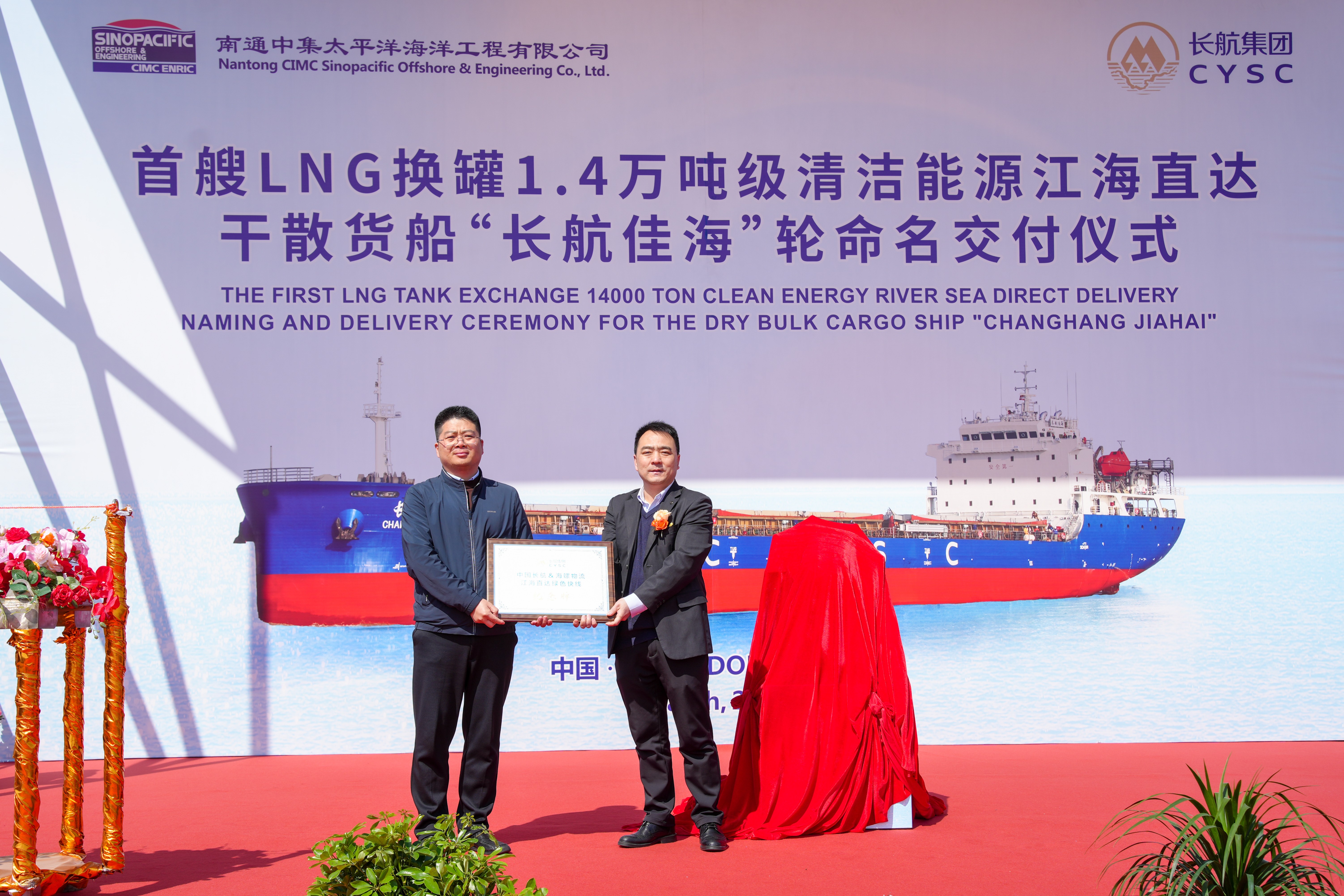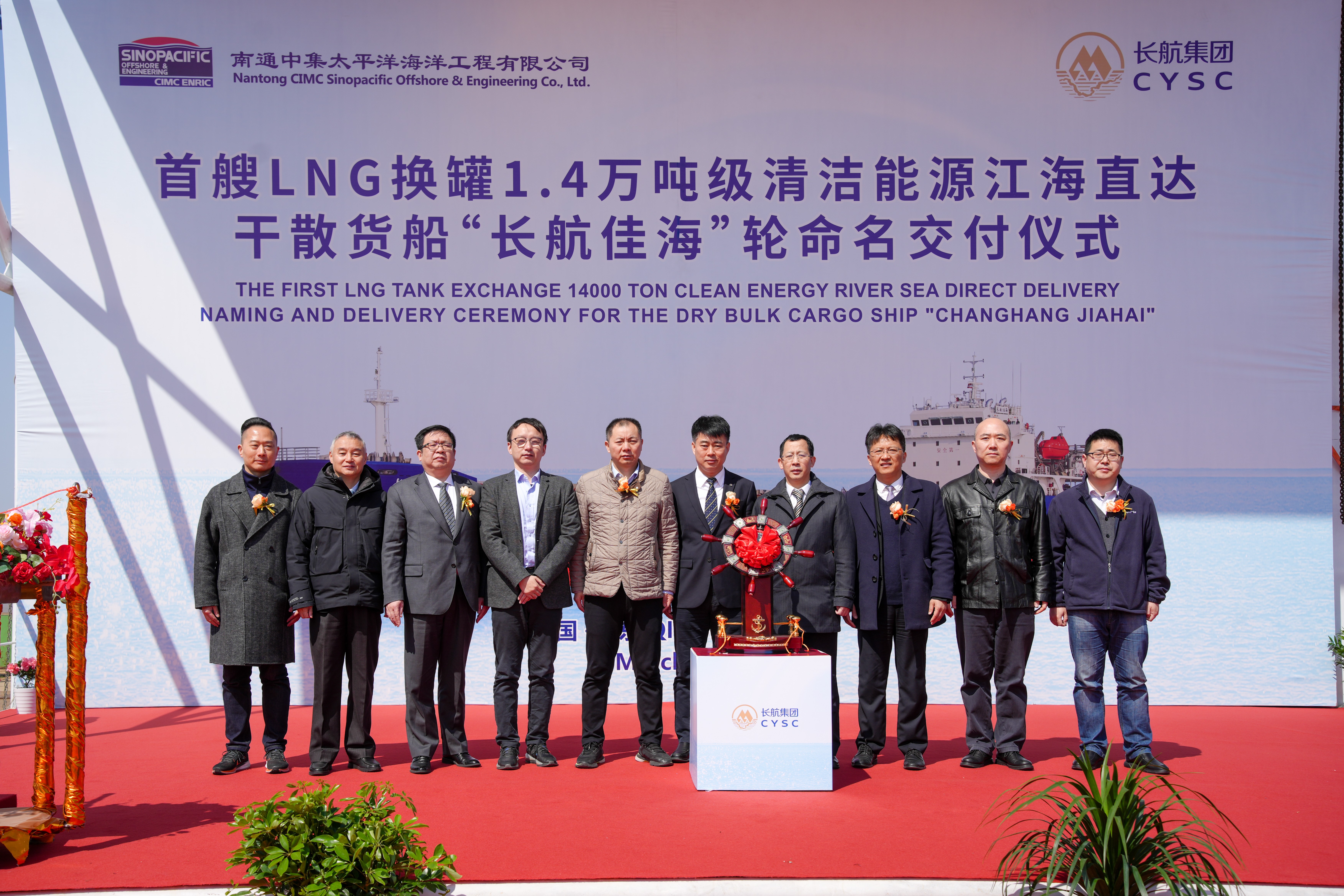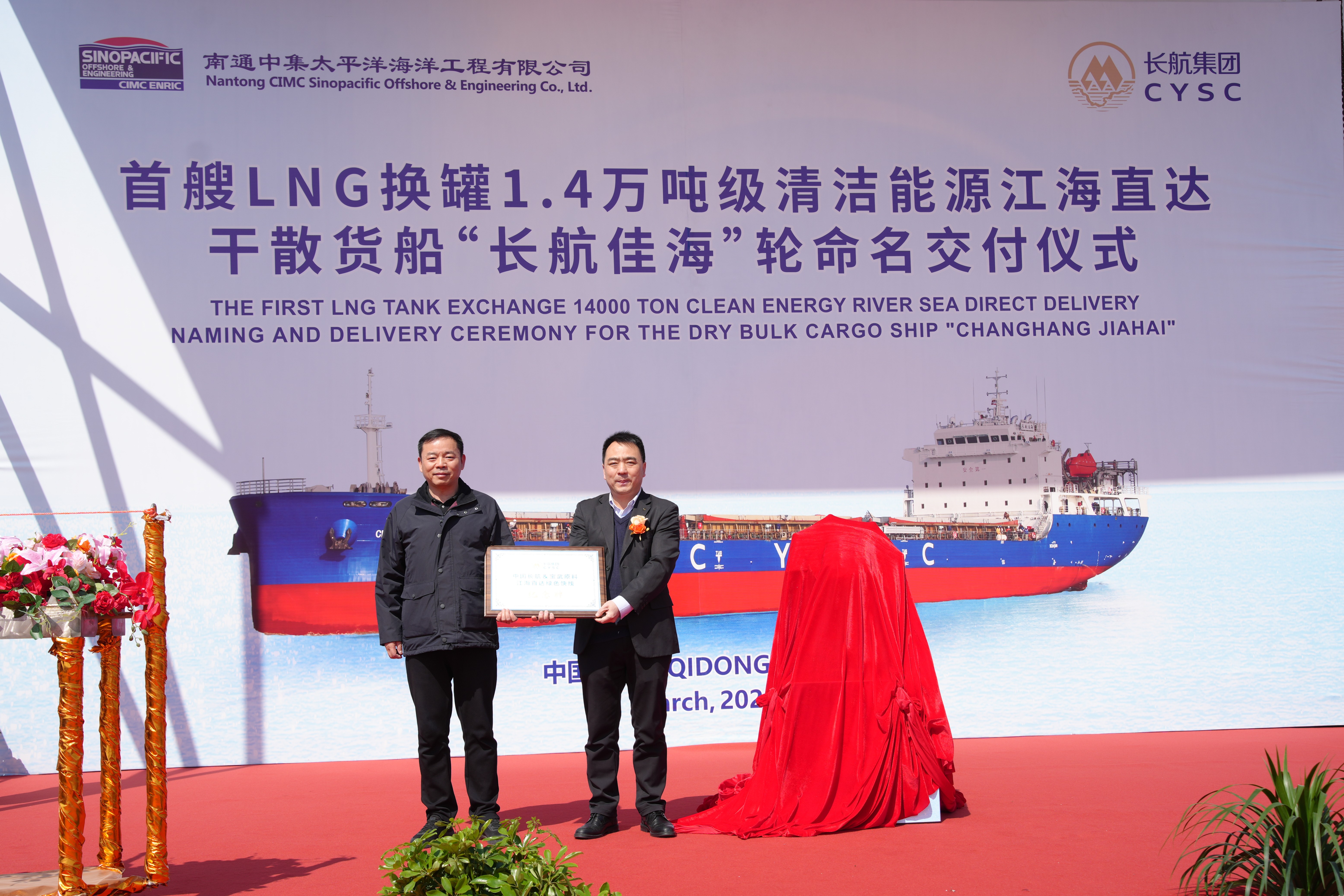 3月18日,南通中集太平洋海洋工程有限公司(以下简称“中集太平洋海工”或“公司”)为长航货运有限公司(以下简称“长航货运”)建造的首艘LNG换罐1.4万吨级清洁能源江海直达干散货船“长航佳海”轮(S1087)在公司东区码头隆重举行命名交付仪式。长航集团副总经理李增忠,宝武原料供应有限公司副总经理方庆舟,上海海螺物流有限公司总经理李广慧,中国船级社江苏分社副总经理杭仲九,中国船级社实业有限公司武汉分公司总经理彭沛文,长江船舶设计院总经理刘皓,中集太平洋海工高级顾问楼吉威、造船事业部副总经理沈林涛,长航货运、马钢、旋力特钢、新兴铸管以及中集太平洋海工等相关负责人共同见证这一重要时刻。