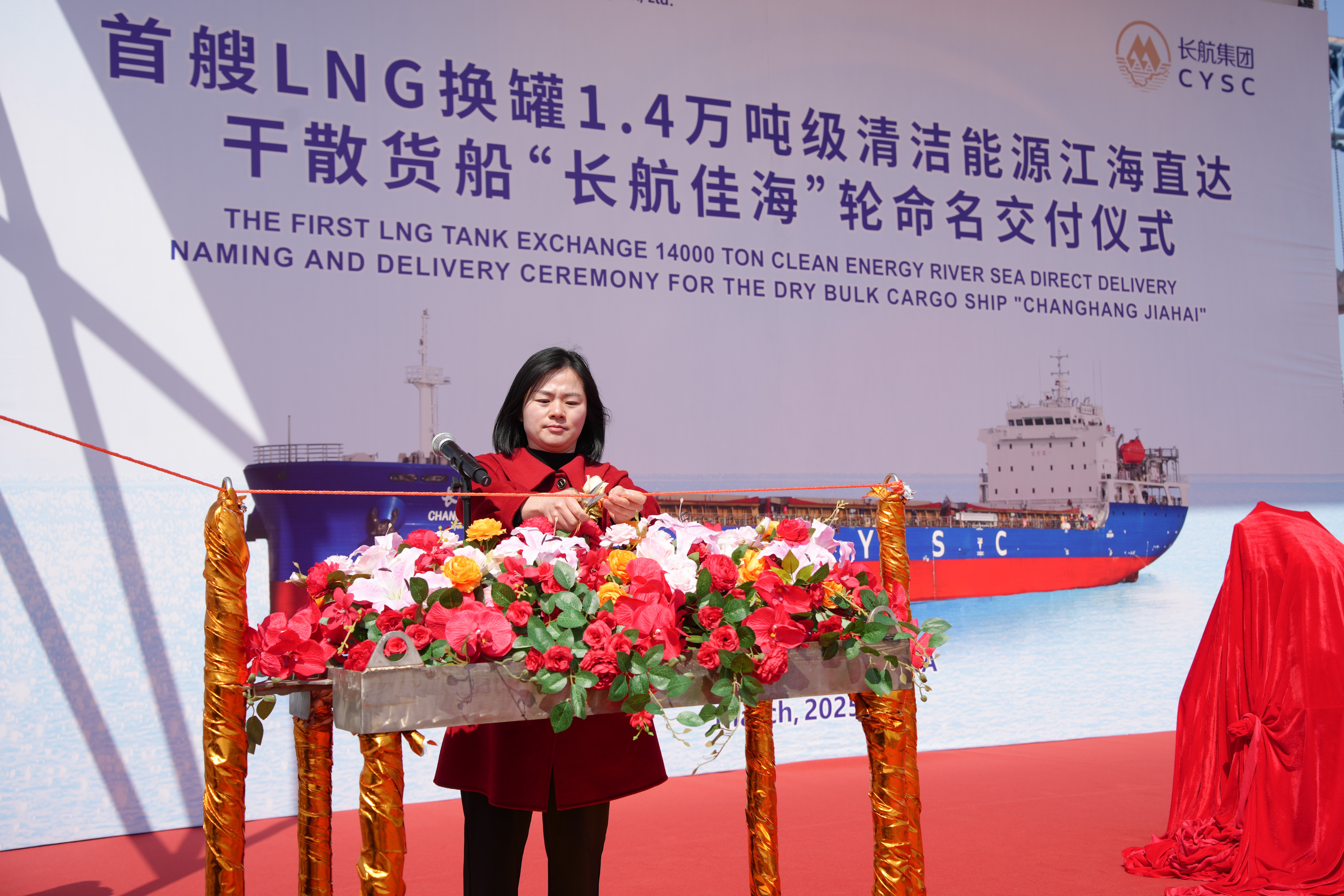 长航货运总经理王明胜将S1087命名为“长航佳海”轮,并祝愿新船在未来的航程中一帆风顺。教母在众人的见证下完成了剪缆仪式,在礼炮声中,所有领导上台,共同拉动红绳进行揭幕,宣布“长航佳海”轮正式交付。