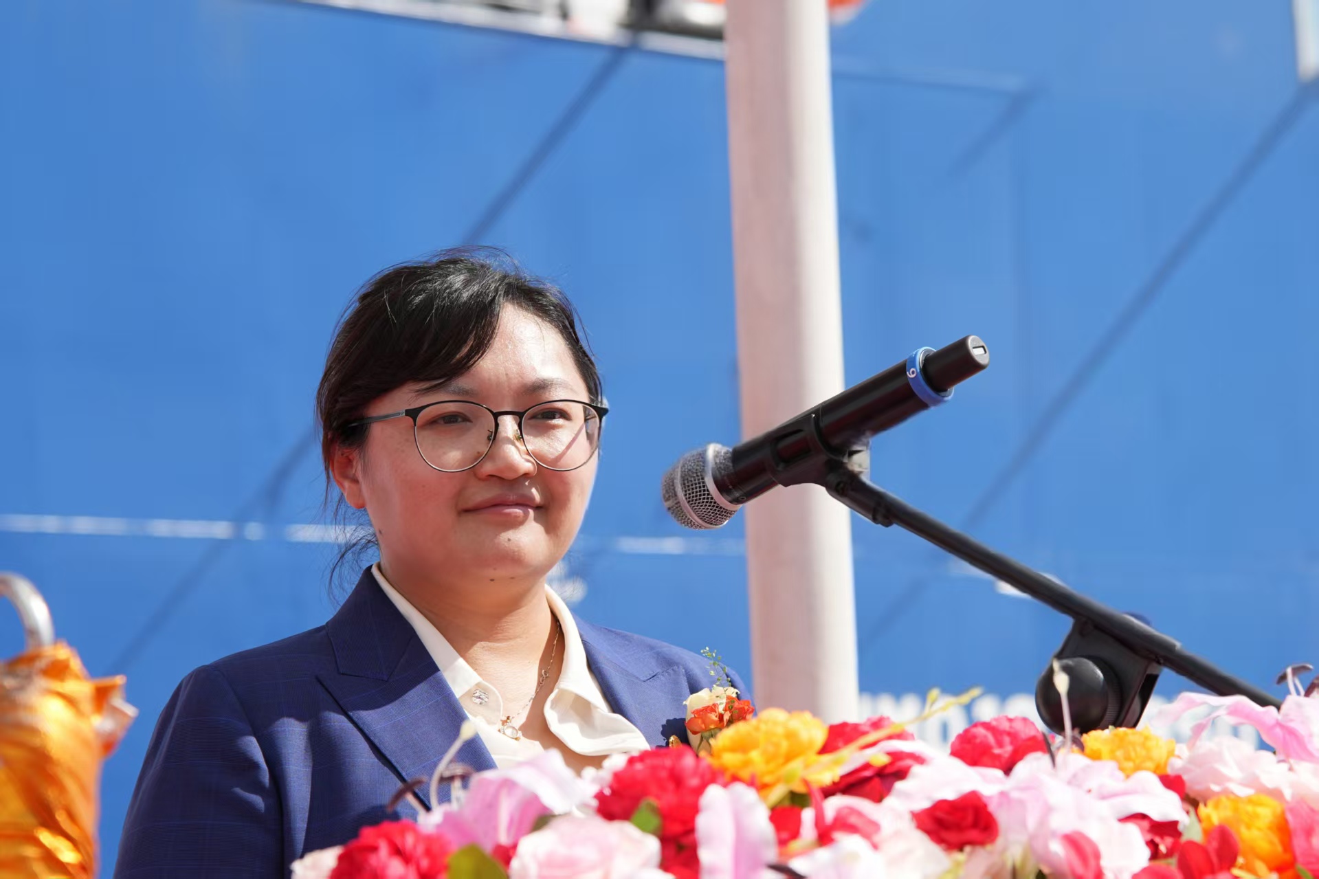 点睛后Ling Yong Wah手持金色剪刀将缆绳剪断,台前喷射出的七彩烟墙犹如绚烂的 “彩带”,象征着项目从建设到交付的 “七彩历程” 与未来作业的 “多彩前景”,为新船送上了最美好的祝愿。