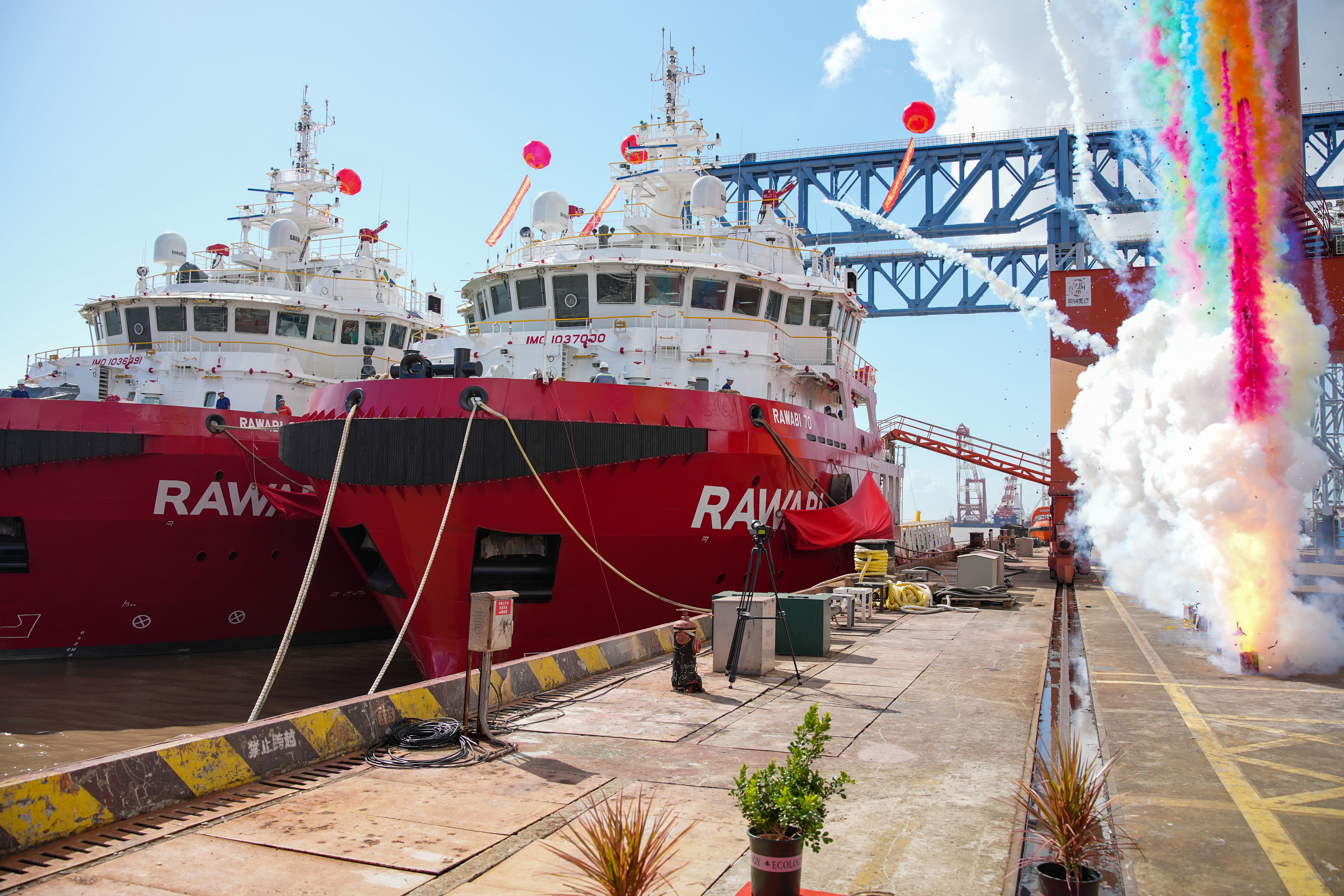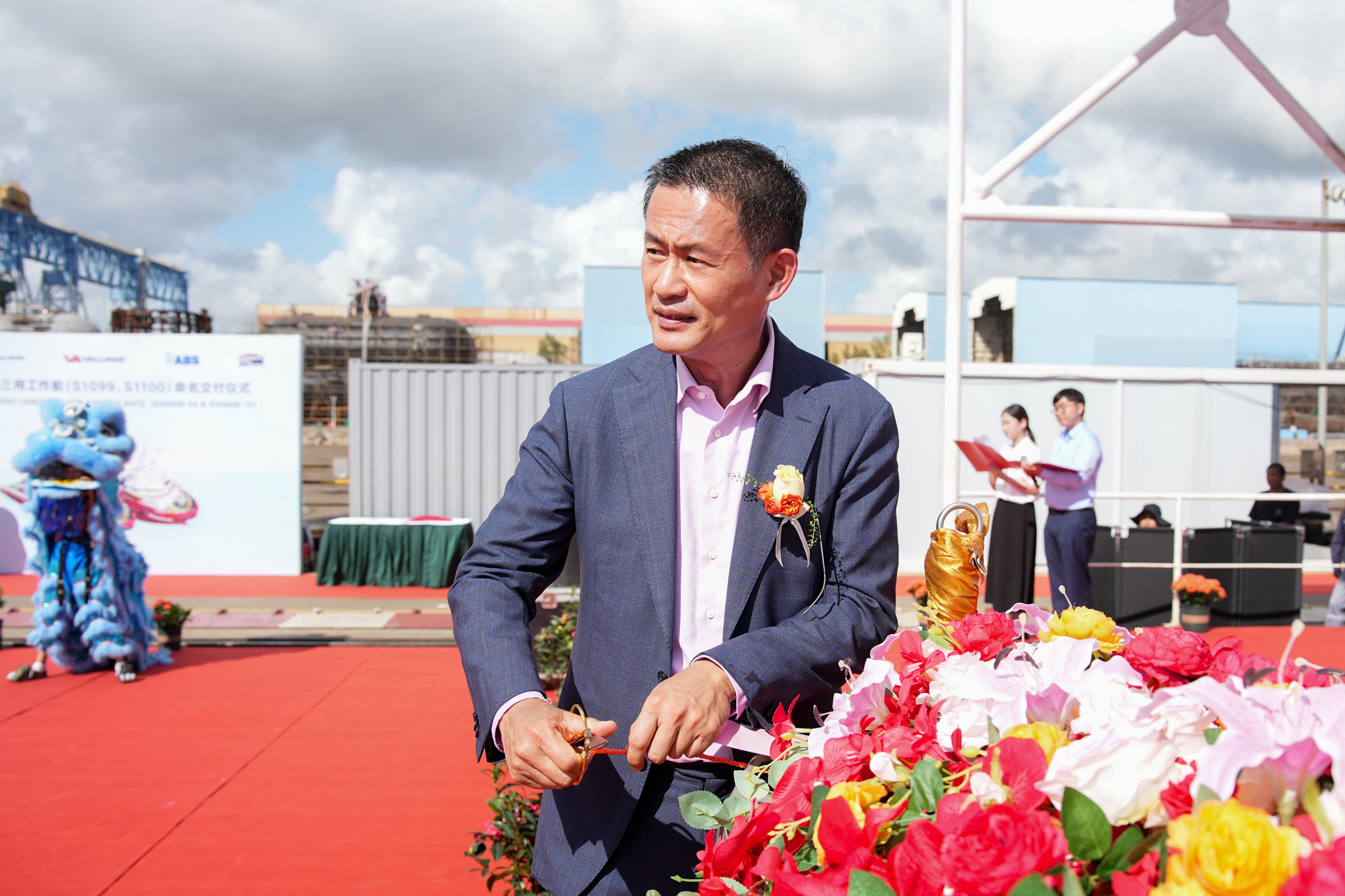 在中集集团迎来投产43周年之际,南通中集太平洋海洋工程有限公司(以下简称“中集太平洋海工”)以实干实绩献上诚挚贺礼。9月22日下午,公司为新加坡客户Vallianz Shipbuilding & Engineering Pte. Ltd.(简称“VSE”)建造的2艘80吨三用工作船S1099、S1100在东区码头举行命名交付仪式。Vallianz执行总裁兼CEO Ling Yong Wah、首席项目官Lam Khee Chong,Quantum总经理谢保成、执行董事刘佳,ABS华中区总经理宋爱民,中集太平洋海工副总经理周鲁兵、造船事业部副总经理沈林涛等相关负责人共同见证这一重要时刻。