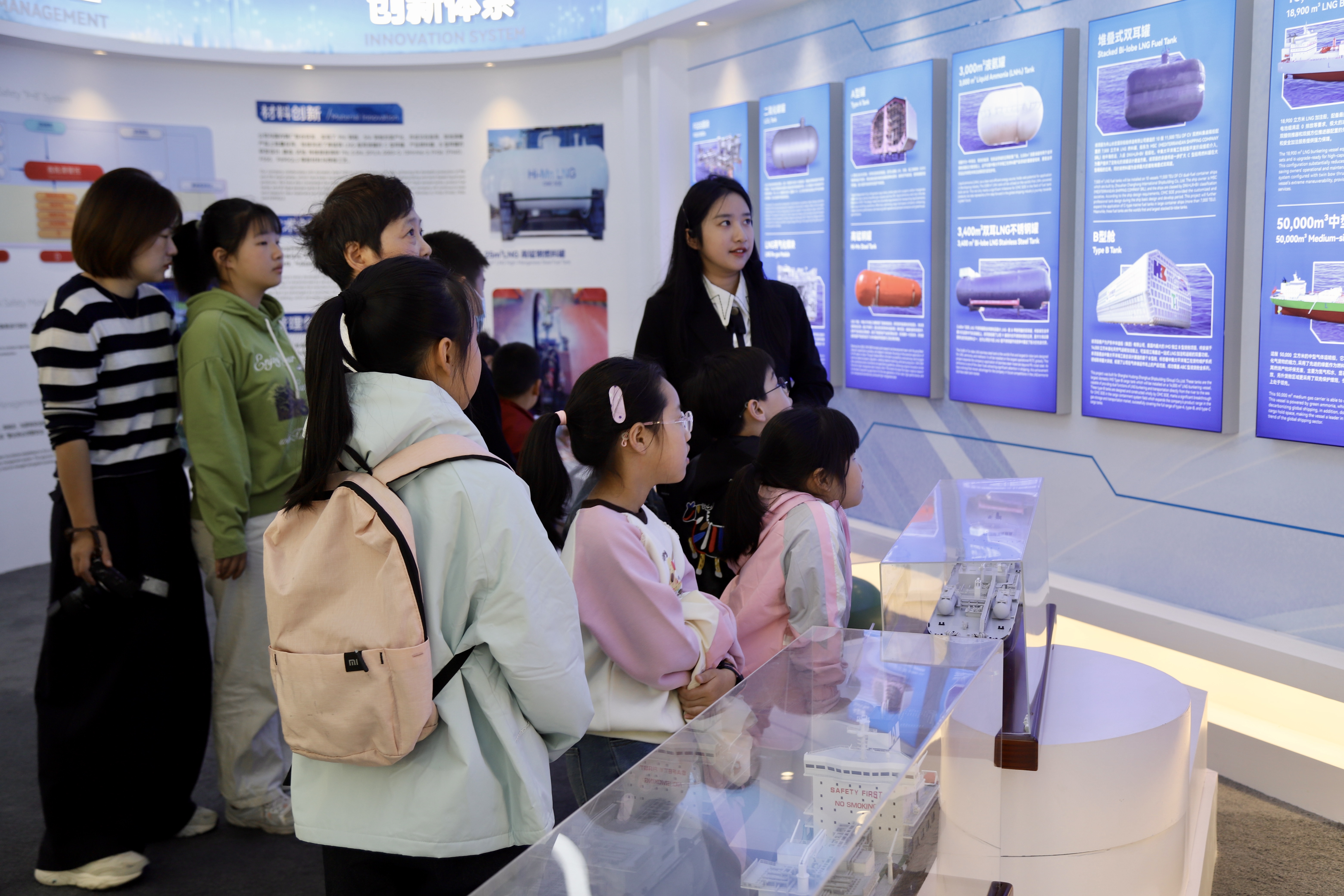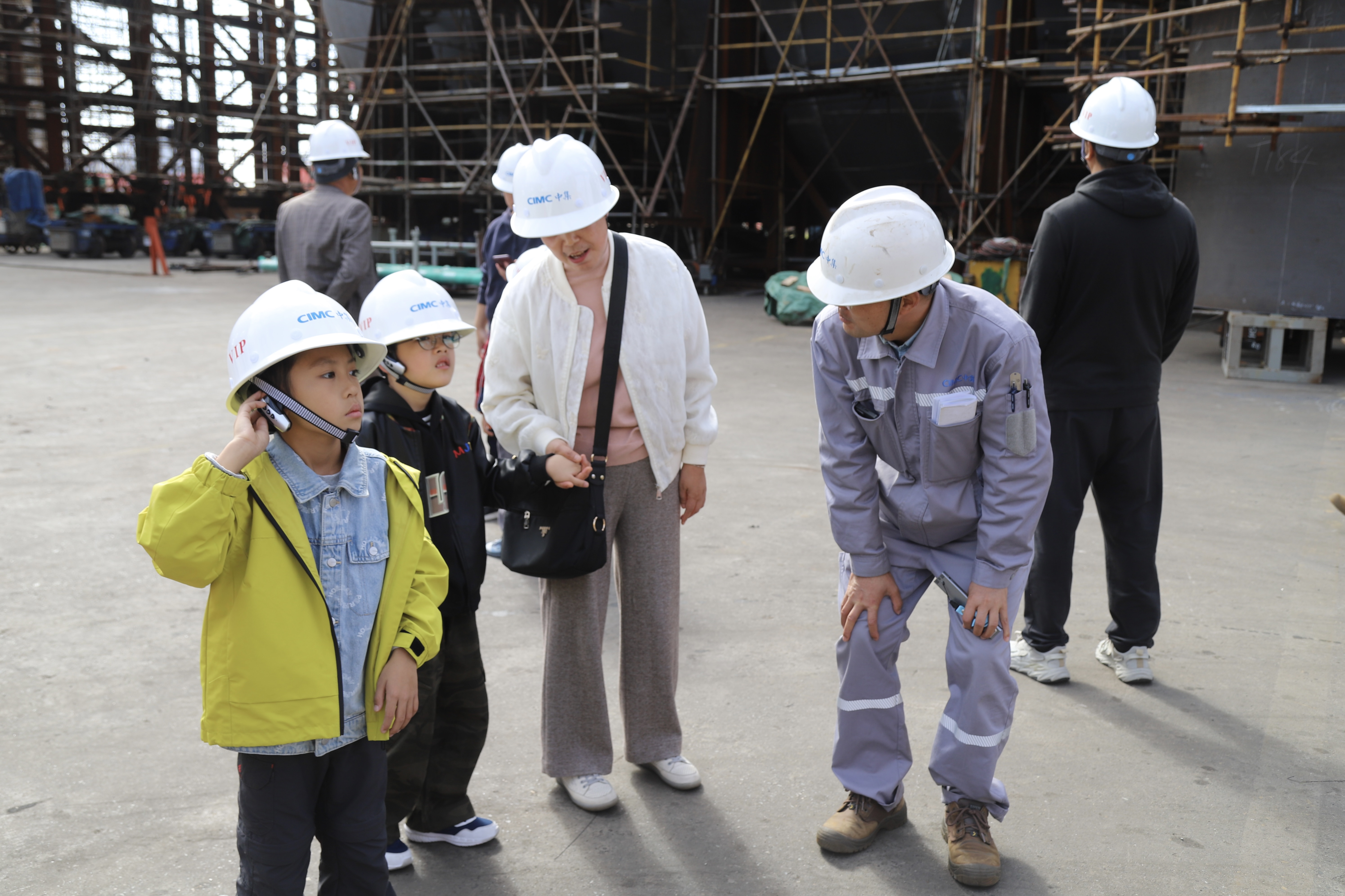 这场探访之旅从公司展厅开始。一进展厅,各式精致的船舶与海工产品模型便牢牢吸引了大家的视线,孩子们趴在展柜前,指着模型兴奋讨论,对父母所从事的事业,第一次有了直观而生动的印象。