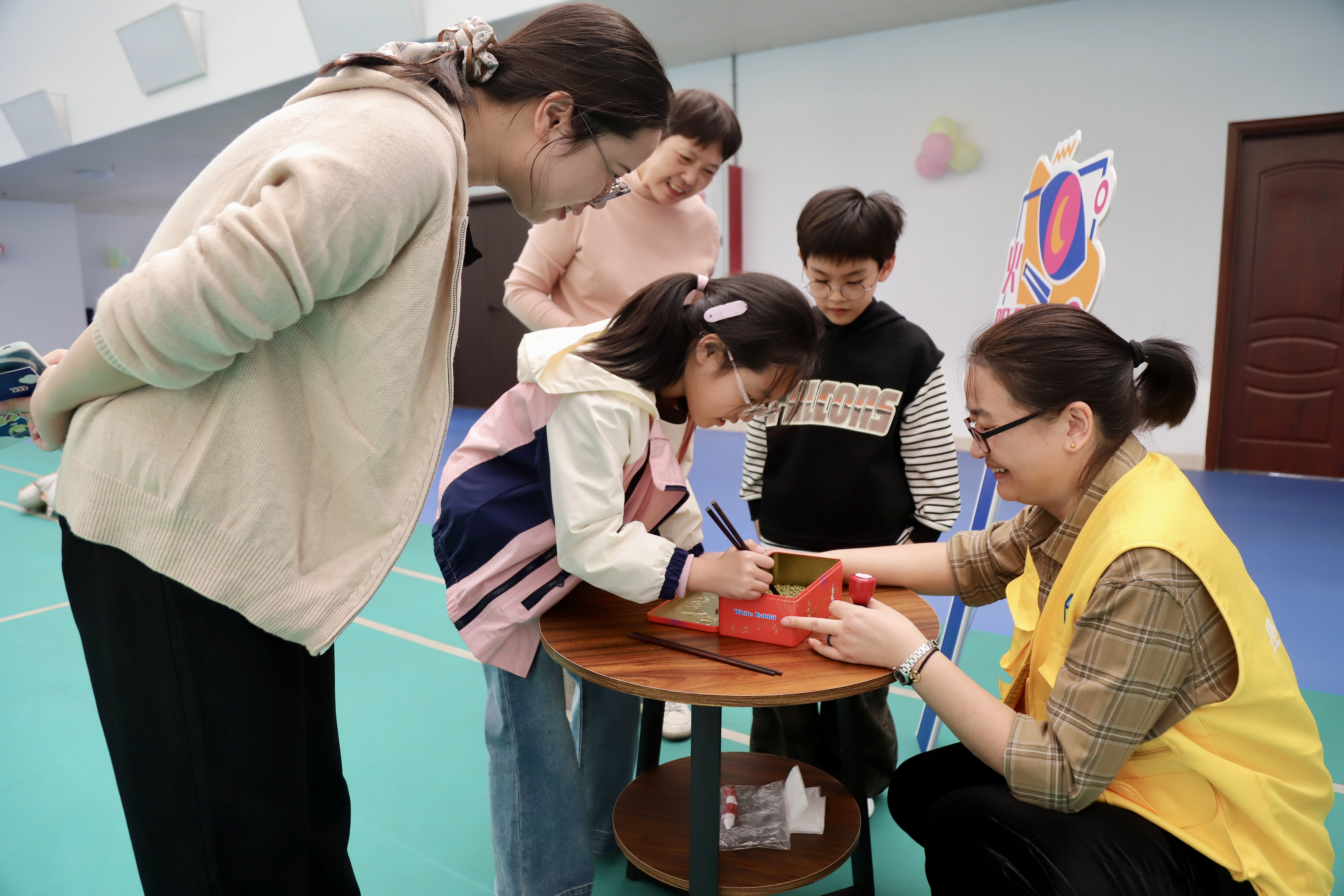 “精准投壶”时,孩子们凝神静气,瞄准壶心,力求一击即中;“你划我猜”项目中,家长们手脚并用、全力演绎,孩子们脑洞大开、积极抢答,滑稽互动引得全场笑声不断;另一边的“鸡飞狗跳”则格外热闹,大家手执扇子,奋力将充气小狗扇向小小的框门,场面紧张又逗趣;“火眼金睛”区,全家齐上阵,眼神专注地在装满绿豆的盒子中寻找十颗红豆;而“极速反应”游戏则挑战考验着每个人的反应力和逆向思维,一时间手忙脚乱的场景,为活动增添了许多欢乐……随着一个个关卡被成功挑战,游戏卡上也盖满了胜利的印章,孩子们兴奋地手持集章卡,前往终点兑换奖品。