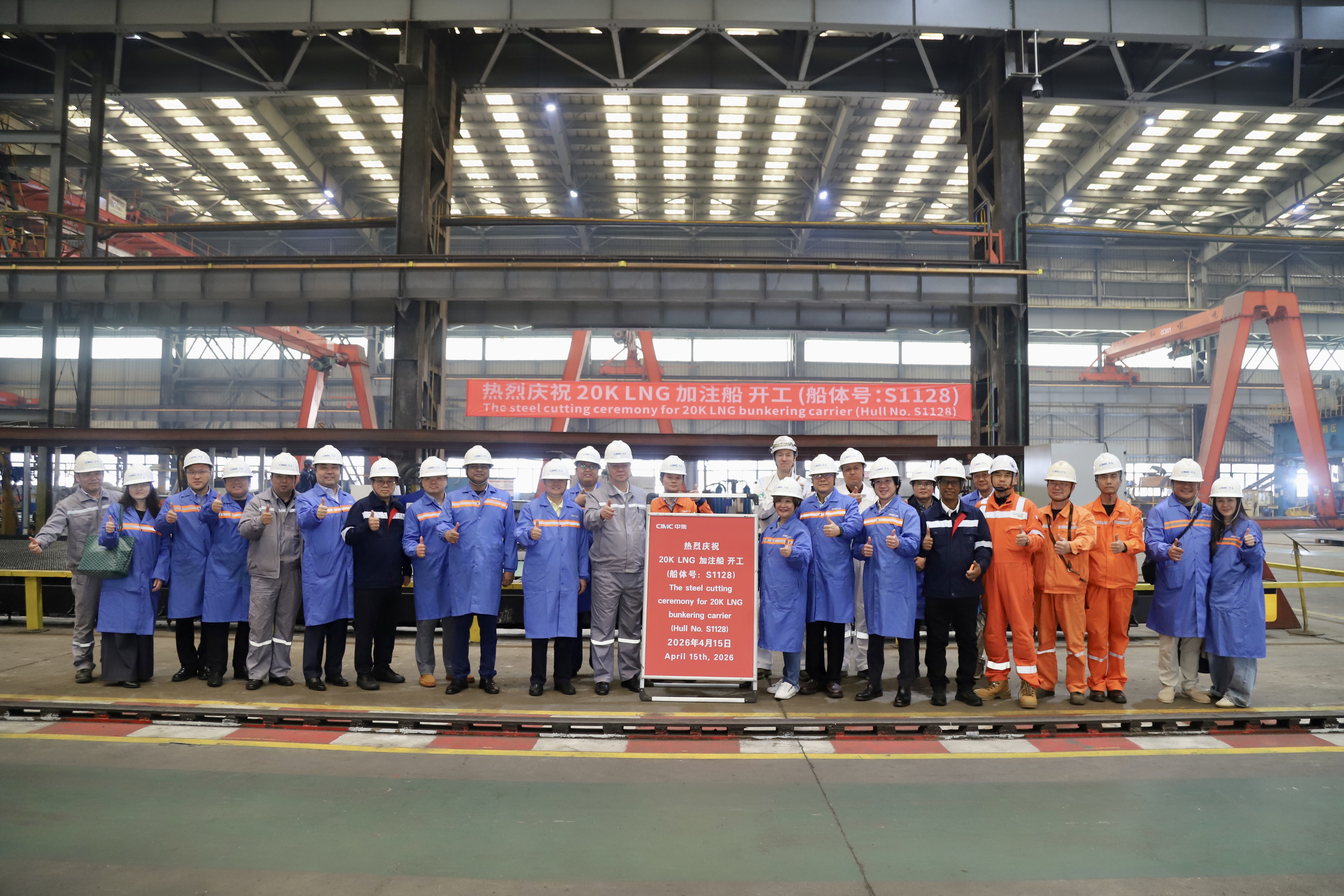 On April 17, the 20,000m³ LNG bunker and carrier for Somtralux SA successfully achieved its keel-laying milestone at the West Zone No. 1 building berth. The event was witnessed by Yves Pauwels, General Manager of shipowner Somtralux SA; Bi Jingtao, China Regional Manager of supervision company EXMAR; Li Jun, representative from DNV; Chen Bin, Deputy General Manager of CIMC SOE's Shipbuilding Business Division; Wen Zhengqing, Director of the Ship Marketing Department; and members of the company's project team.