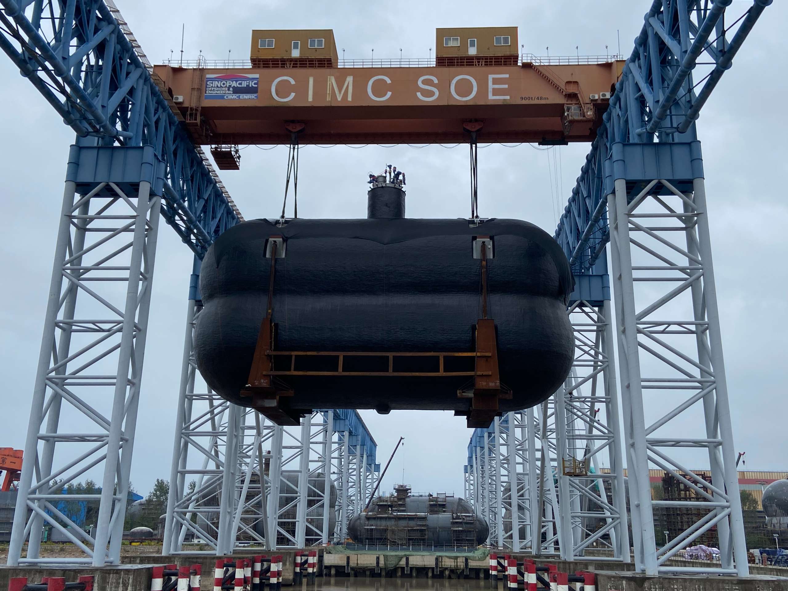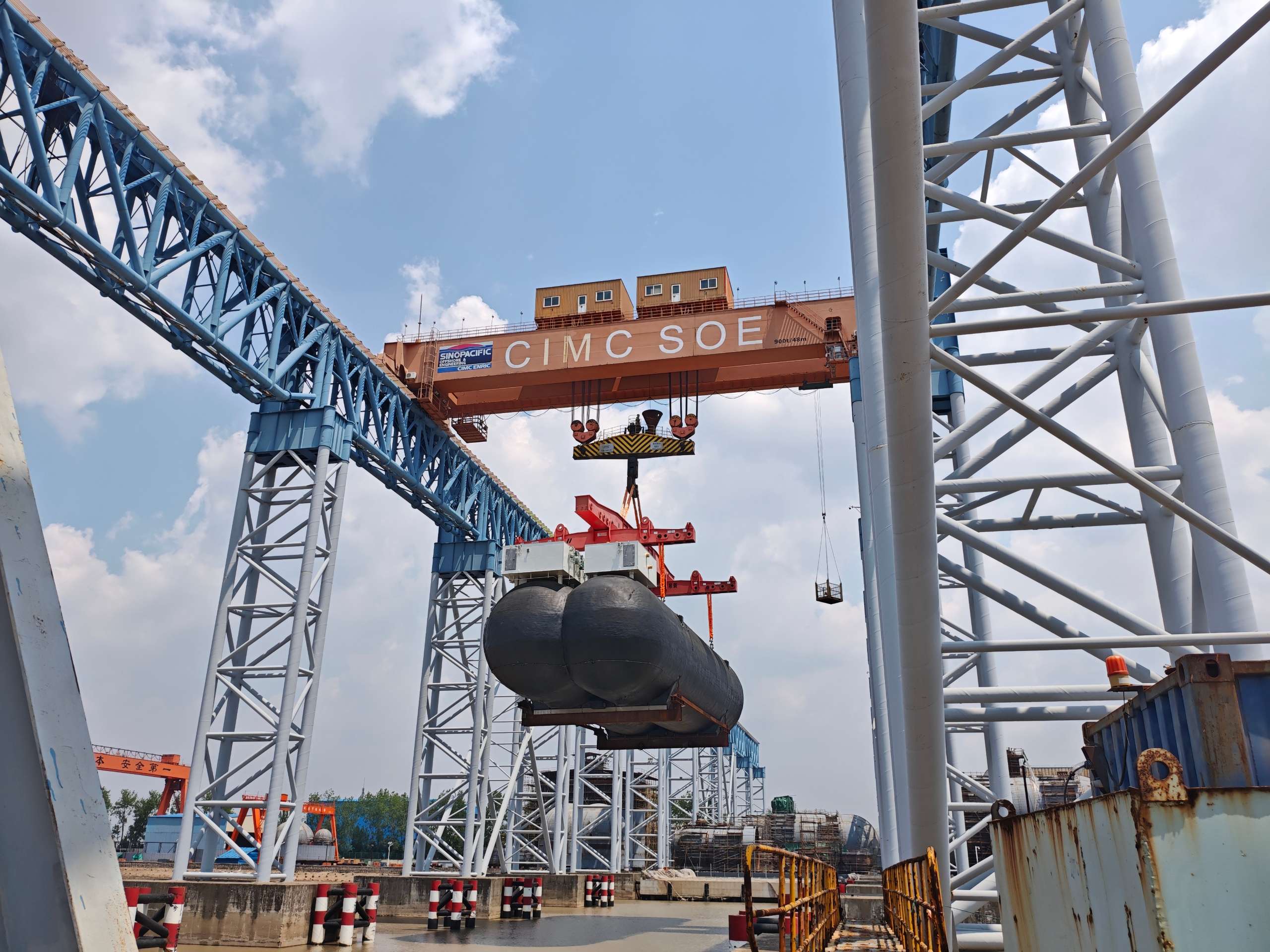 2022年8月,中集太平洋海工与外高桥合作的前两套2800方燃料罐4只罐吊装、发货顺利完成。