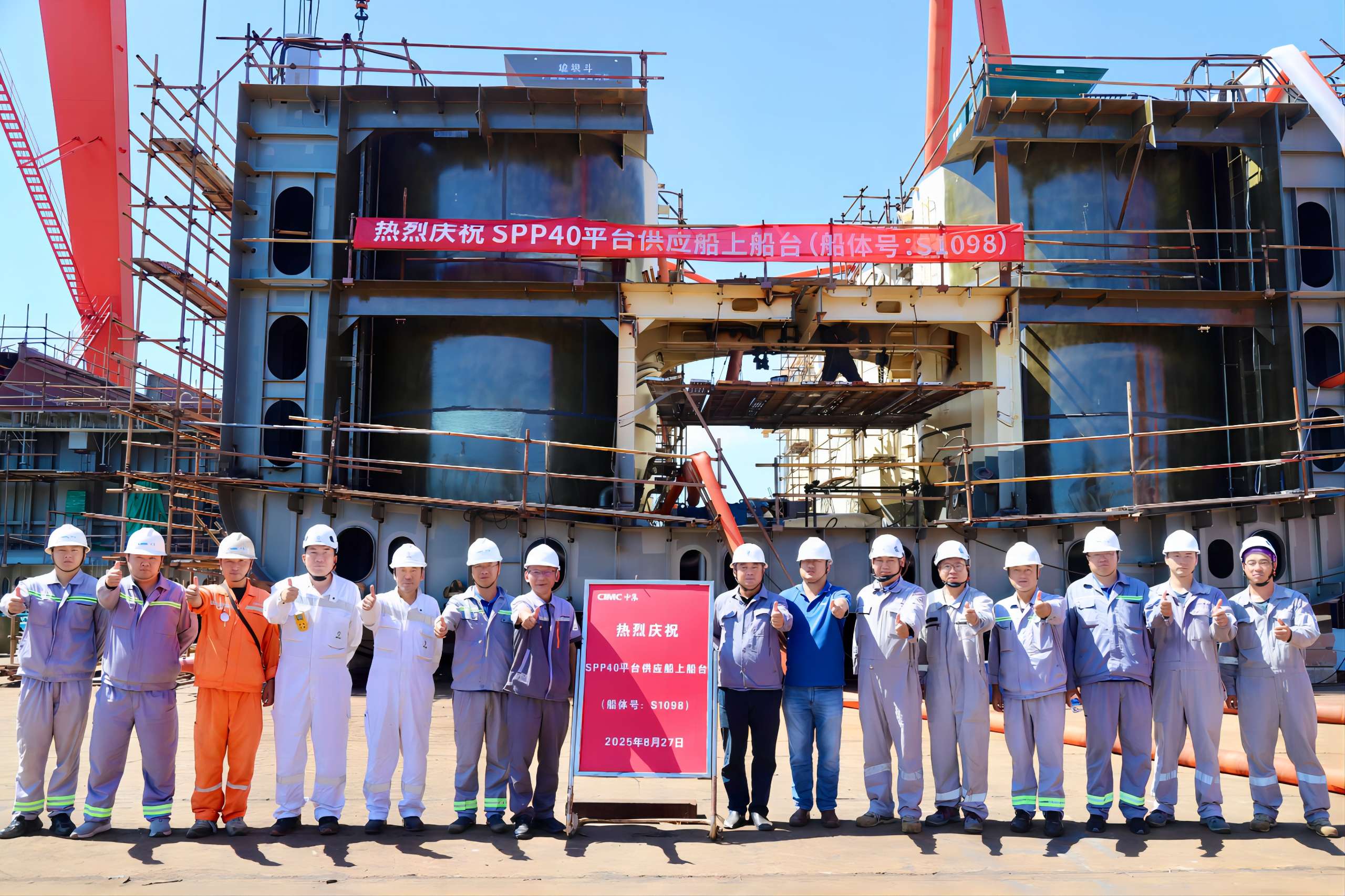 2025年7月31日,中集太平洋海工第三艘石油平台供应船顺利完成上船台节点