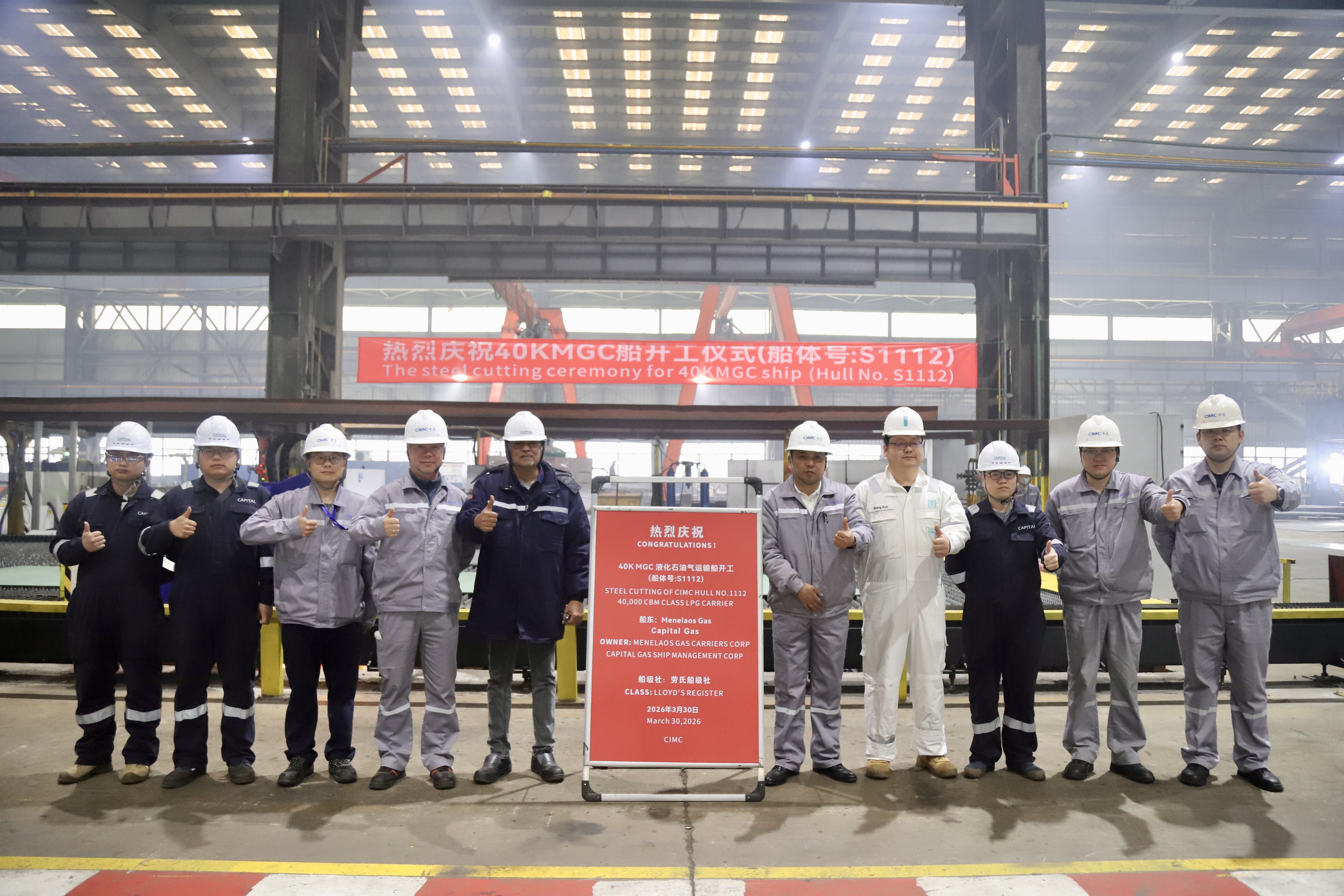 3月30日,中集太平洋海工为希腊知名船东Capital Gas建造的第二艘40000立方米LPG/液氨运输船(船体号:S1112)顺利开工。船东驻厂经理Raj Bajaj、LR项目经理王巡及团队代表、中集太平洋海工造船事业部副总经理陈彬及公司项目团队共同见证了钢板切割启动仪式。