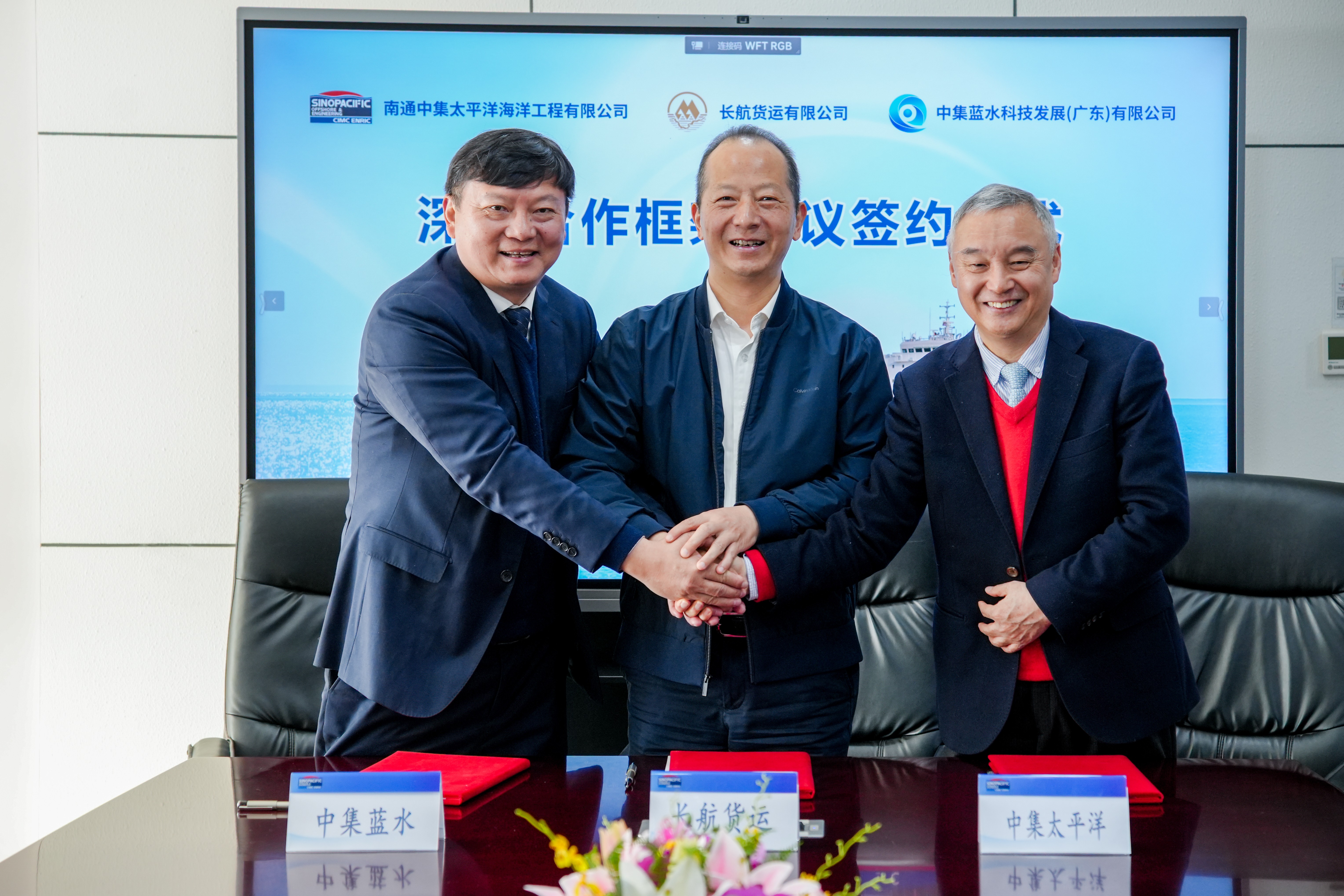 仪式开始前,中集太平洋海工、中集蓝水科技与长航货运共同签署了《深度合作框架协议》,这不仅是对三方合作成果的确认,也为未来更深入的战略协作奠定了坚实基础。
