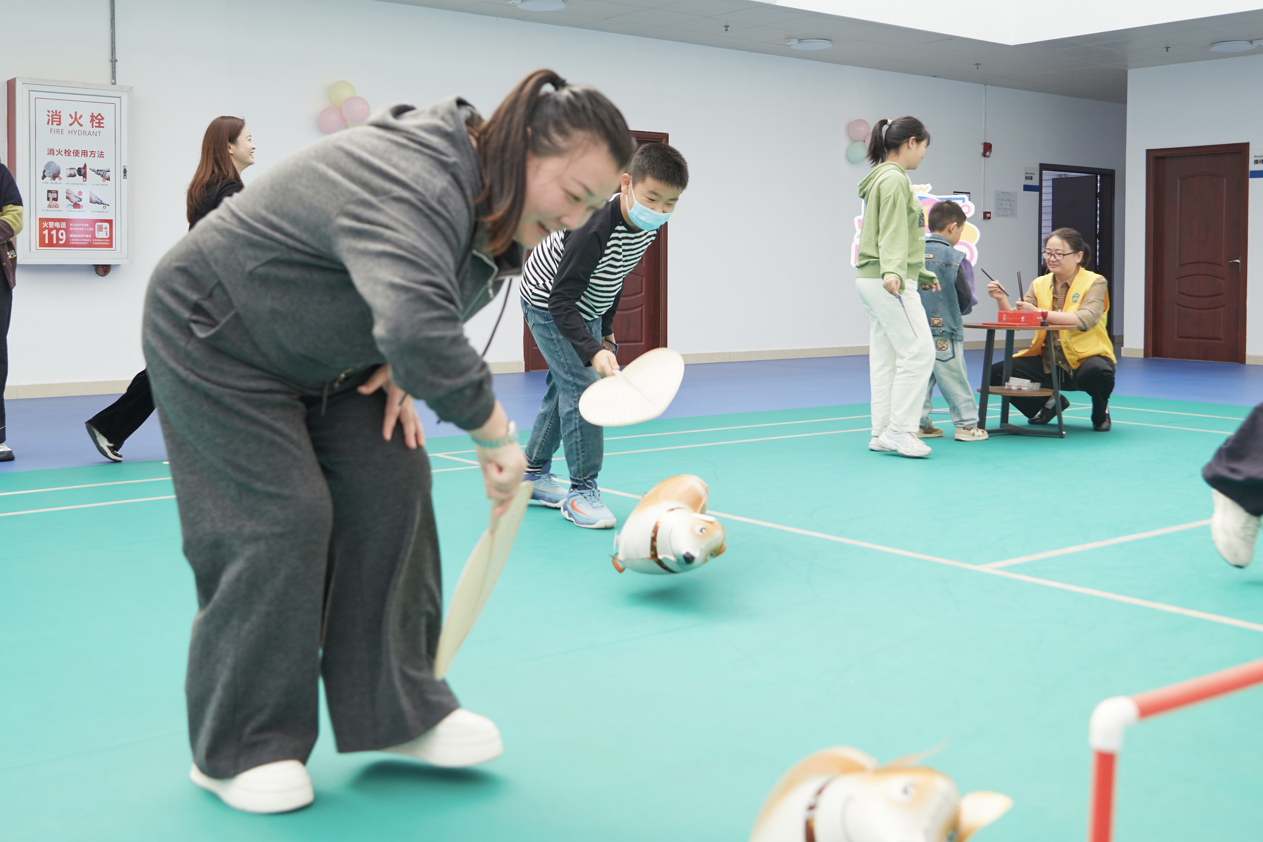 “精准投壶”时,孩子们凝神静气,瞄准壶心,力求一击即中;“你划我猜”项目中,家长们手脚并用、全力演绎,孩子们脑洞大开、积极抢答,滑稽互动引得全场笑声不断;另一边的“鸡飞狗跳”则格外热闹,大家手执扇子,奋力将充气小狗扇向小小的框门,场面紧张又逗趣;“火眼金睛”区,全家齐上阵,眼神专注地在装满绿豆的盒子中寻找十颗红豆;而“极速反应”游戏则挑战考验着每个人的反应力和逆向思维,一时间手忙脚乱的场景,为活动增添了许多欢乐……随着一个个关卡被成功挑战,游戏卡上也盖满了胜利的印章,孩子们兴奋地手持集章卡,前往终点兑换奖品。