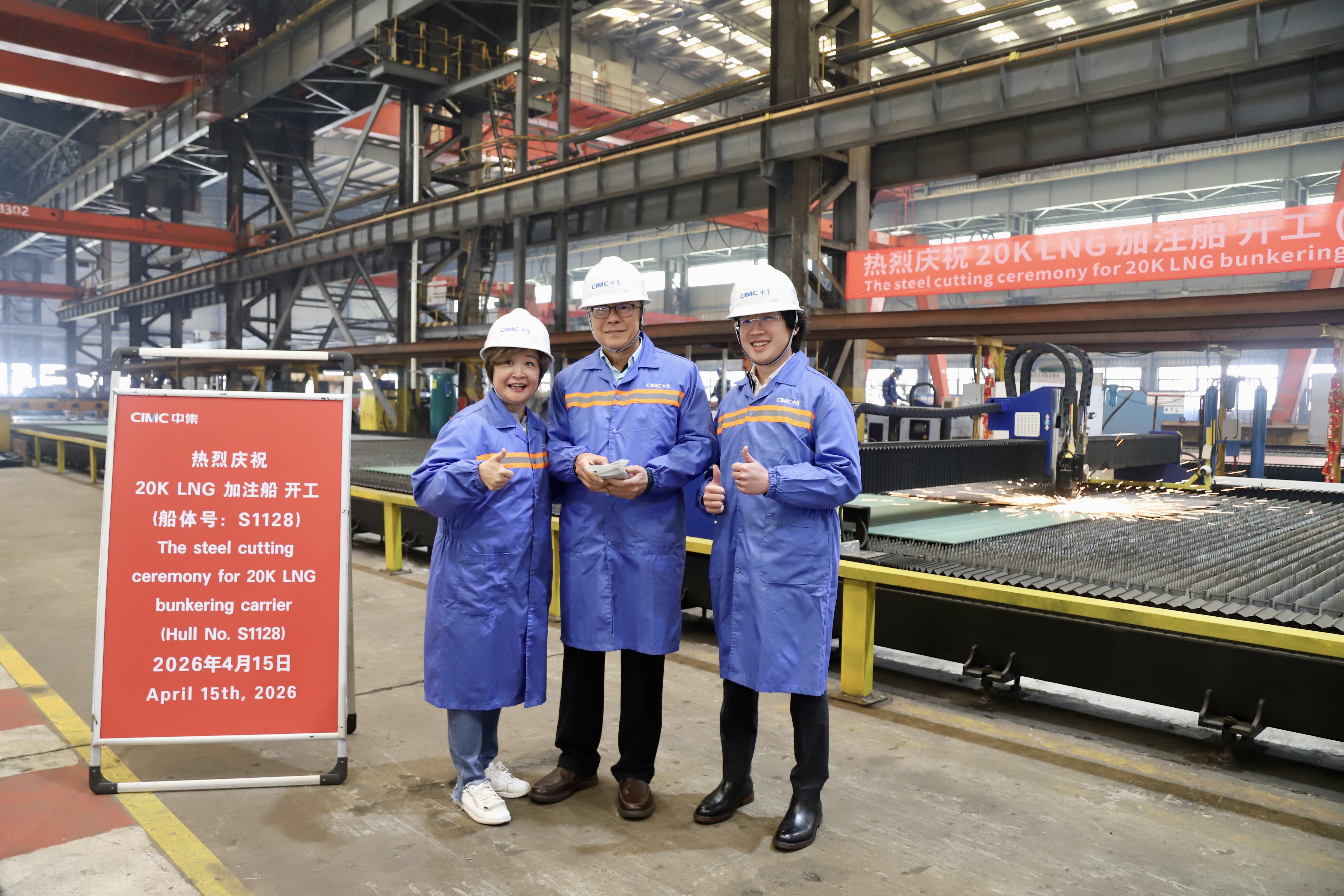 On April 15, the construction commencement ceremony for the 20,000m³ LNG bunker and carrier for EMF was held at the West Zone Manufacturing Division workshop. The ceremony was witnessed by Choong Sheen Mao, COO of EMF; Choong Kien Siong, President; Choong-Ong Gek Hoon, Managing Director; Goutam Saha, SMC Site Manager; Lu Caigen, representative from DNV; Wang Jianding, Executive Deputy General Manager of CIMC SOE; Shang Jinyan, Deputy General Manager; Wei Guangsheng, Assistant General Manager; Lou Jiwei, Senior Advisor; Chen Bin, Deputy General Manager of the Shipbuilding Business Division; and members of the company's project team.