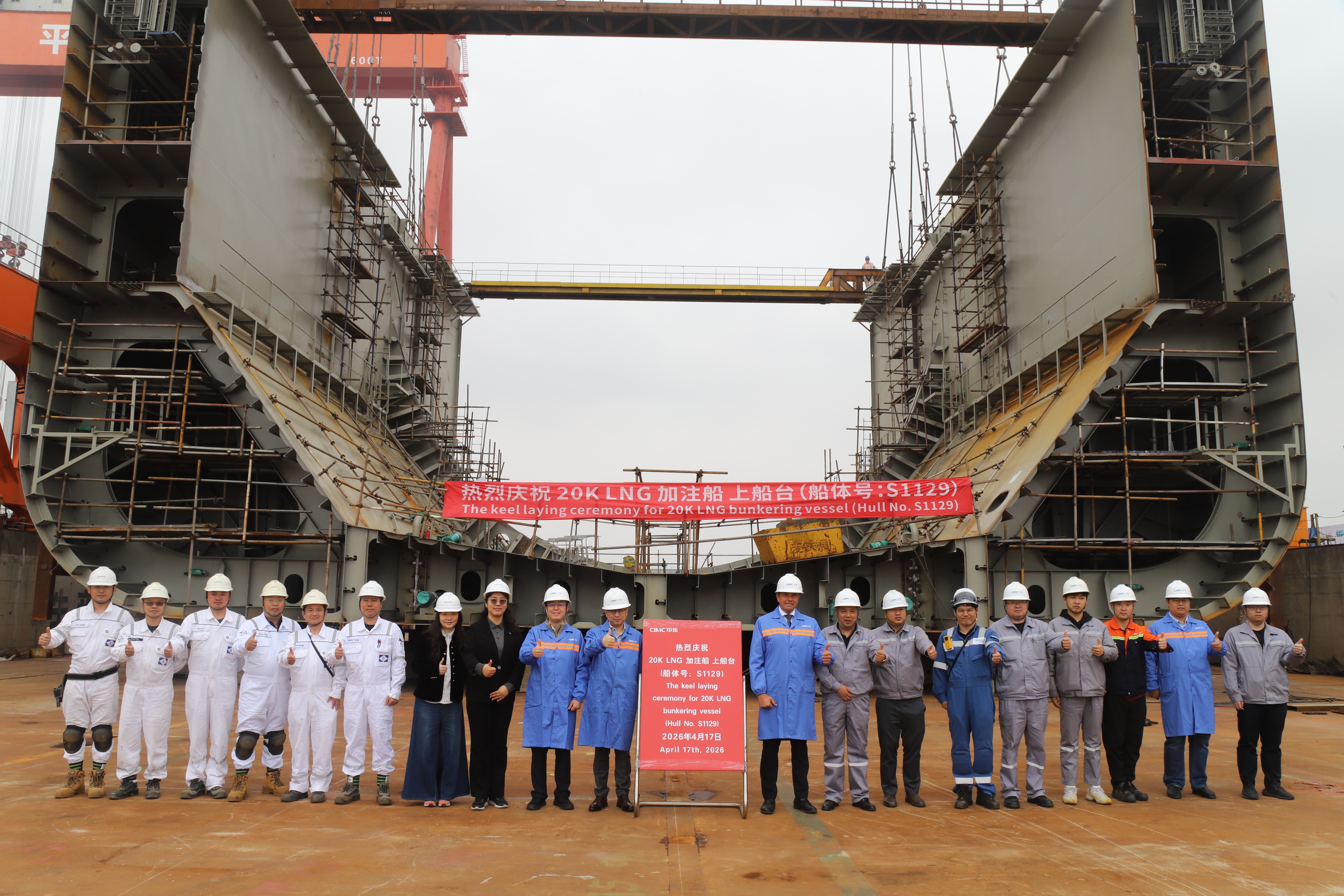 On April 17, the 20,000m³ LNG bunker and carrier for Somtralux SA successfully achieved its keel-laying milestone at the West Zone No. 1 building berth. The event was witnessed by Yves Pauwels, General Manager of shipowner Somtralux SA; Bi Jingtao, China Regional Manager of supervision company EXMAR; Li Jun, representative from DNV; Chen Bin, Deputy General Manager of CIMC SOE's Shipbuilding Business Division; Wen Zhengqing, Director of the Ship Marketing Department; and members of the company's project team.